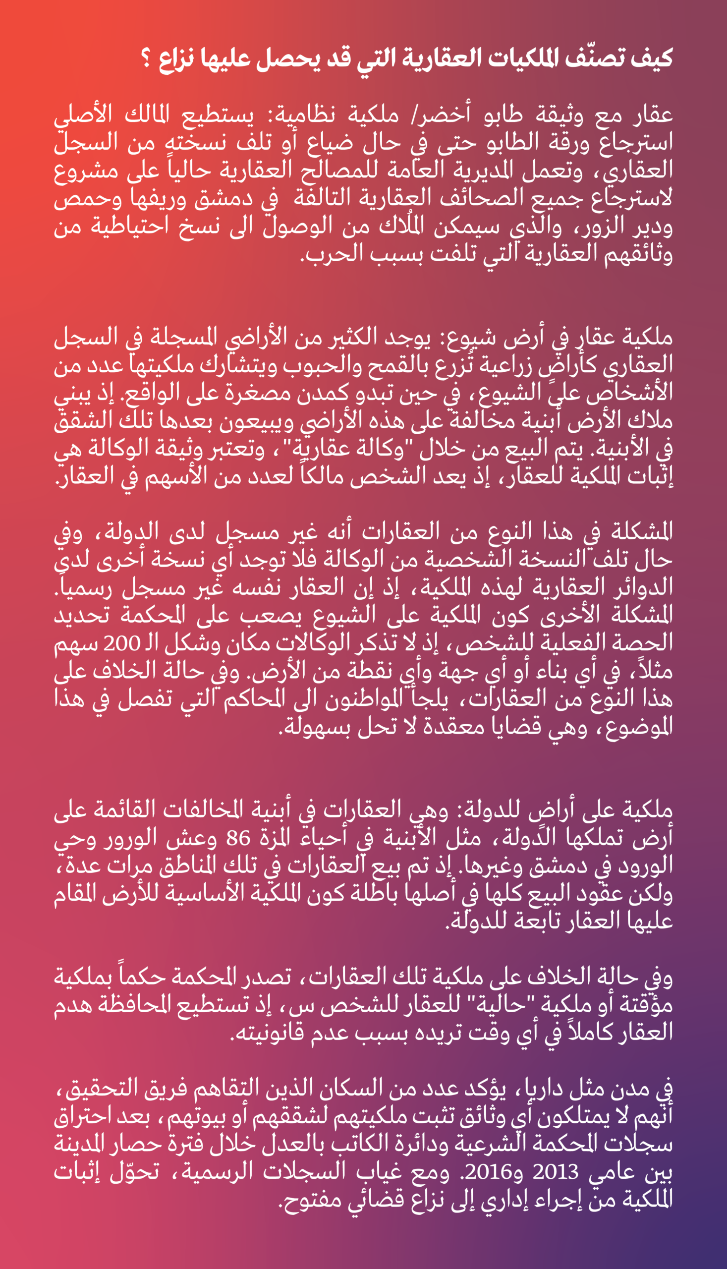 في هذا التحقيق الاستقصائي، نتتبع عبر مقابلات شخصية، وتحليل وثائق الملكيات العقارية والشكاوي، ومراجعة القوانين والقرارات الحكومية، كيف ساهم فقدان الوثائق ومستندات الملكية خلال سنوات الحرب في منع آلاف السوريين اليوم من الانتفاع بمنازلهم، بسبب عجزهم عن إثبات ملكية منازلهم، والتي في غالب الأحيان تملّكها غرباء خلال فترات غيابهم، وتم تغيير الملكية أو تم غصب العقار بسبب خلوه من السكان.