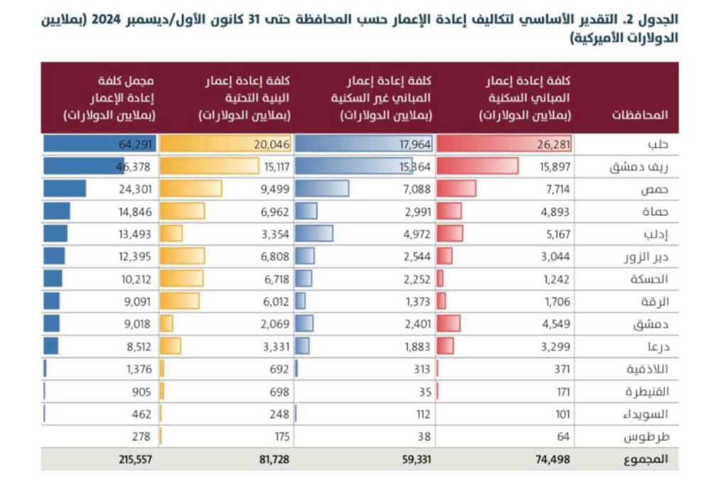 وفقًا لمساعد الأمين العام ومدير المكتب الإقليمي للدول العربية في برنامج الأمم المتحدة الإنمائي، عبد الله الدردري، كان في سوريا قبل الحرب نحو 5.5 مليون منزل. من بينها، 328 ألف منزل دُمرت بالكامل، ما يعني أن منزلًا من كل ثلاثة منازل تعرّض للتدمير أو الضرر الجزئي.