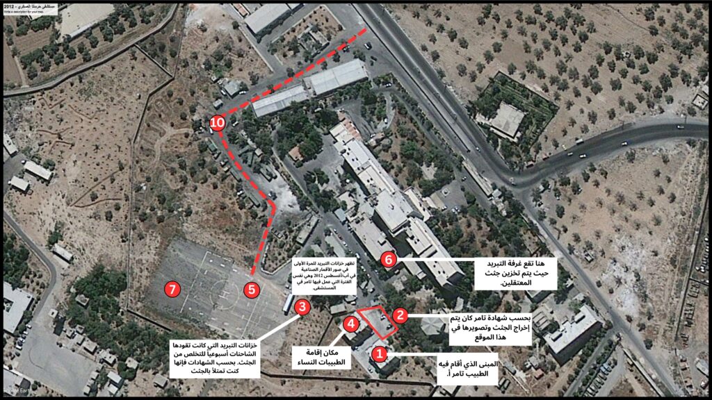 وأكد الطبيب أنه شاهد بعينه خلال خدمته في العام 2012، كيف كان يتم ملء خزانات التبريد البيضاء (الموقع 3) بأكياس الجثث السوداء الخارجة من المستشفى، واستطاع رؤية ذلك بوضوح من المبنى الذي كان يقيم فيه (الموقع 1)