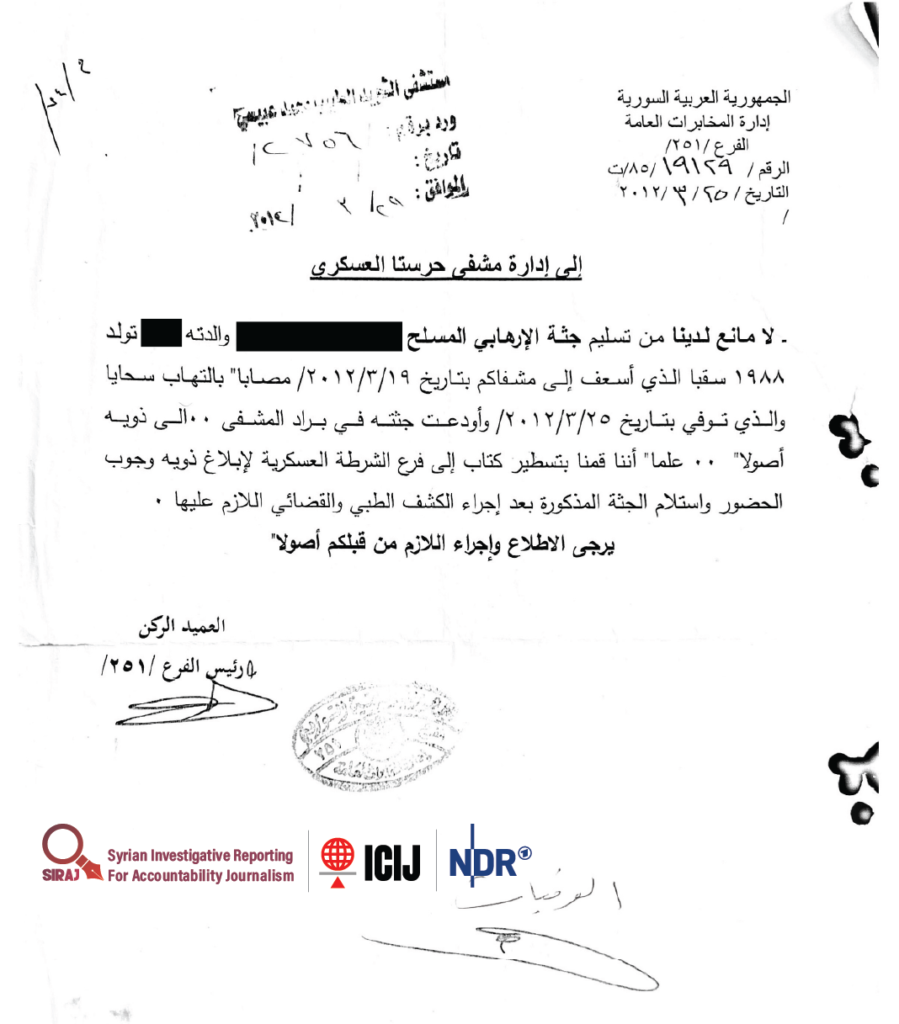 وثيقة صادرة عن رئيس الفرع 251 بتسليم جثة معتقل إلى ذويه بعد وفاته في مستشفى حرستا العسكري – سراج/ICIJ/ NDR