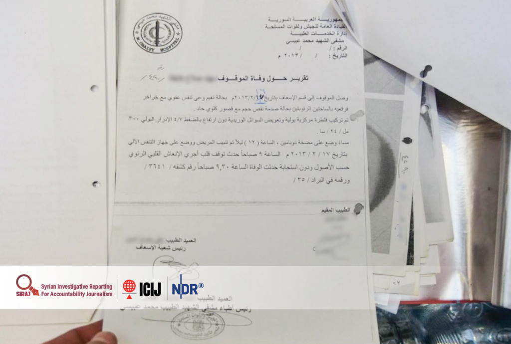 في هذا التحقيق المشترك بين الوحدة السورية للصحافة الاستقصائية “سراج”، والاتحاد الدولي للصحفيين الاستقصائيين “ICIJ”، وهيئة الاذاعة والتلفزيون  العامة الألمانية “NDR” وصحيفة جنوب ألمانيا (زود دويتشه تسايتونغ) ضمن مشروع “ملفات دمشق”، نكشف عبر وثائق حصرية اطلعنا عليها من المستشفيات العسكرية، كيف ساهم عشرات الأطباء، ومنهم من لا يزال يمارس الطب بألمانيا، في تعذيب المعتقلين، وتزوير أسباب وفاتهم في سجون الأسد والمنشآت الطبية..