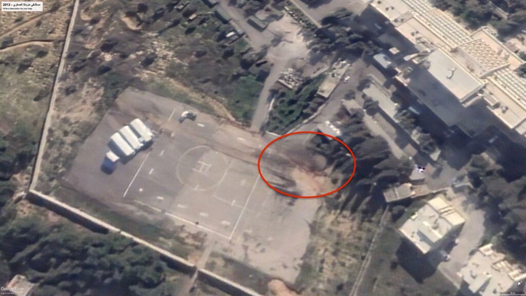 صورة بالأقمار الصناعية لآثار يحتمل أنها لدماء في موقع وقوفبرادات تخزين ونقل الجثث في مستشفى حرستا العسكري – المصدر: ماكسار