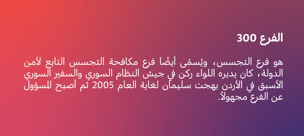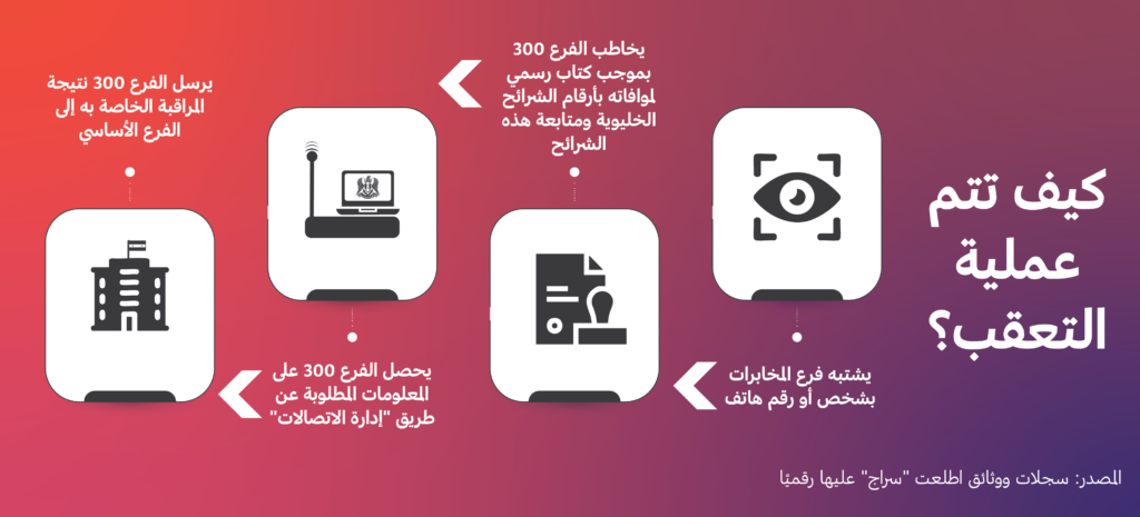 كانت أفرع الأمن كافة ترفع أسماء محددة أو أرقام هواتف أو أرقاماً وطنية لأشخاص، وتخاطب الفرع 300 ليتواصل مع “إدارة الاتصالات” لجلب البيانات المطلوبة، بما في ذلك الأرقام الصادرة والواردة، واسم صاحب الرقم، وآخر ظهور جغرافي له، وفي بعض الأحيان محتوى مسجّل للمكالمات والرسائل، وهو ما يتقاطع مع كلام الخبير غزال.