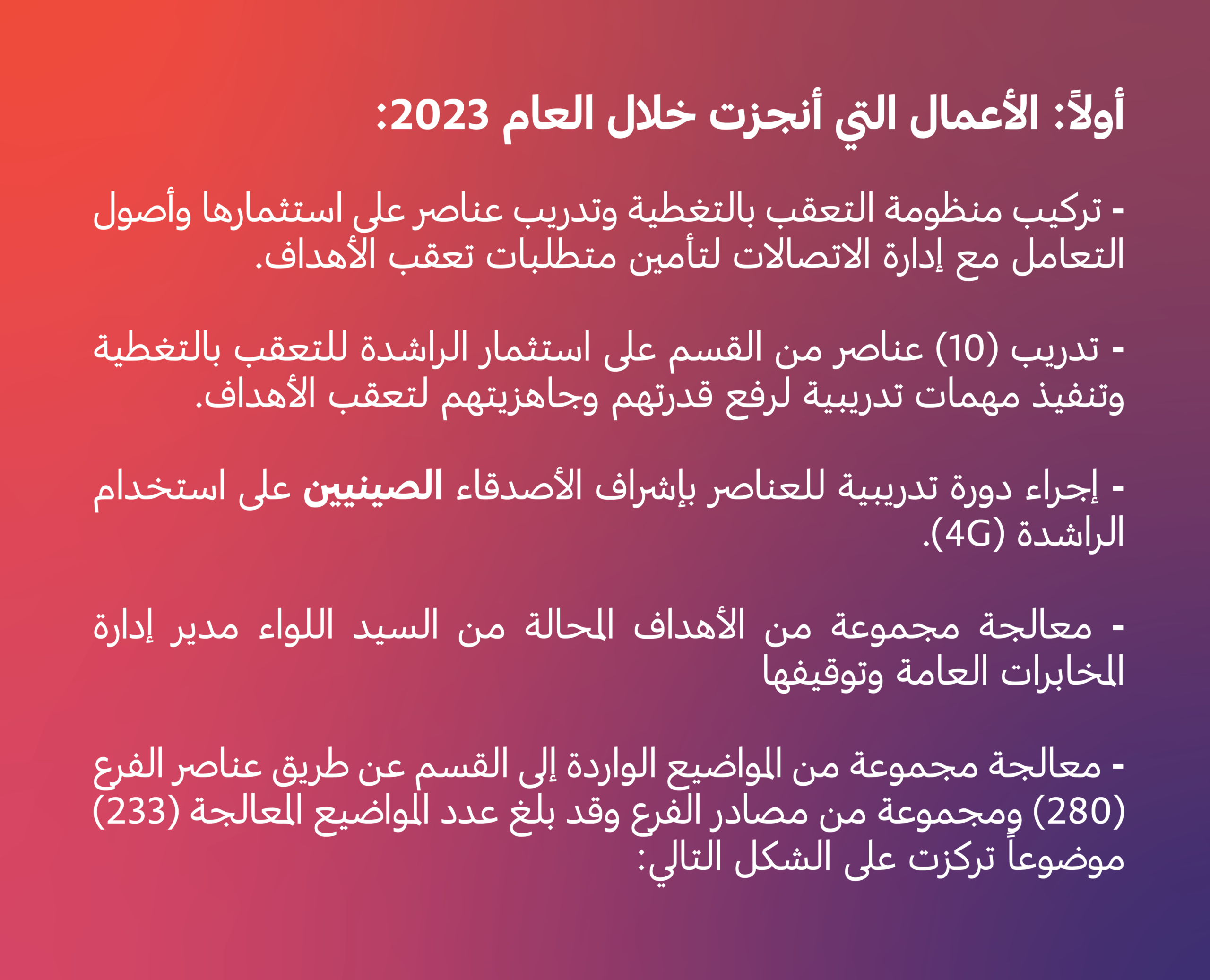 في السياق نفسه، تم تركيب منظومة التعقب بالتغطية وتدريب عناصر على استثمارها وأصول التعامل مع إدارة الاتصالات لتأمين متطلبات تعقب الأهداف، وتدريب عشرة عناصر من القسم (جهاز المخابرات) على استثمار الراشدة، للتعقب بالتغطية وتنفيذ مهمات تدريبية لرفع قدرتهم وجاهزيتهم لتعقّب الأهداف.