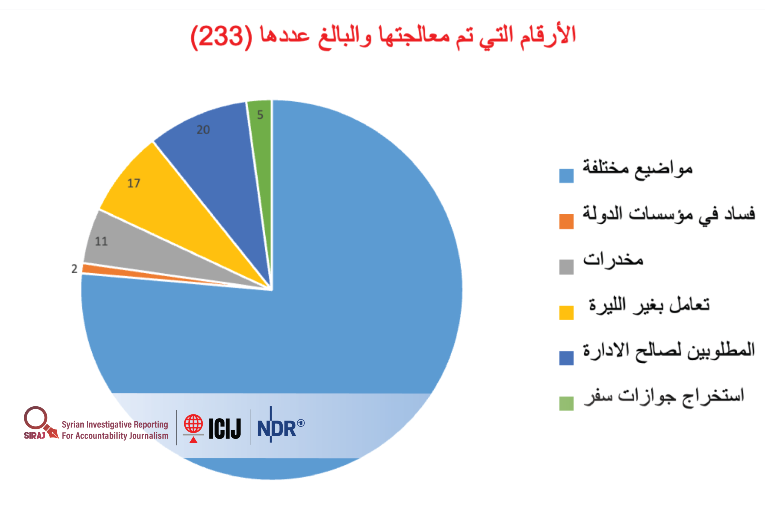 بإشراف ومتابعة من لوقا، تم تتبّع 233 هدفاً (الرسم التوضيحي أدناه) لأشخاص عاديين بهدف إلقاء القبض عليهم، من بينها 178 بتهم (مواضيع مختلفة) من دون تحديد تفاصيلها، وموضوعين يتضمّنان فسادًا في مؤسسات الدولة، وخمس مواضيع استخراج جوازات سفر، و11 موضوع مخدرات، و17 موضوع تعامل بغير الليرة السورية، و20 موضوع مطلوبين لصالح إدارة المخابرات.