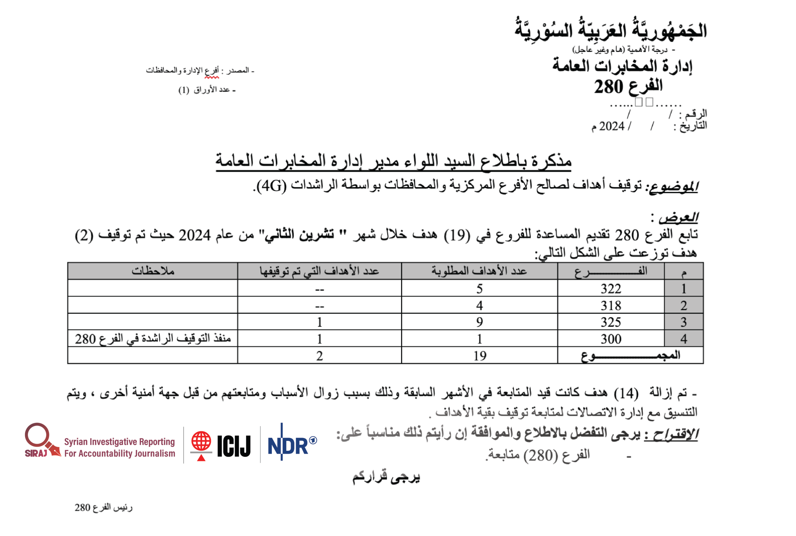 تشير وثيقة حصرية أخرى إلى أنه تم معالجة مجموعة الأهداف (التي تم تعقبها) المحالة من السيد اللواء مدير إدارة المخابرات العامة، وتم توقيفها واعتقالها، إضافةً إلى معالجة مجموعة من المواضيع الواردة إلى القسم عن طريق عناصر الفرع (280) ومجموعة من مصادر الفرع.