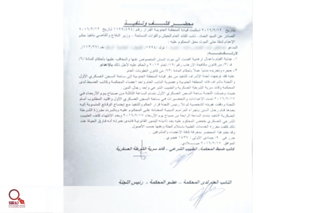 In one order dated January 16, 2020, the name “Assistant Yazan M.” (listed in the execution documents) appears as the individual tasked with blindfolding detainees before execution. In another document, the signature of “Amer T.”, a dentist, appears in his capacity as the medical officer accompanying the execution committee.