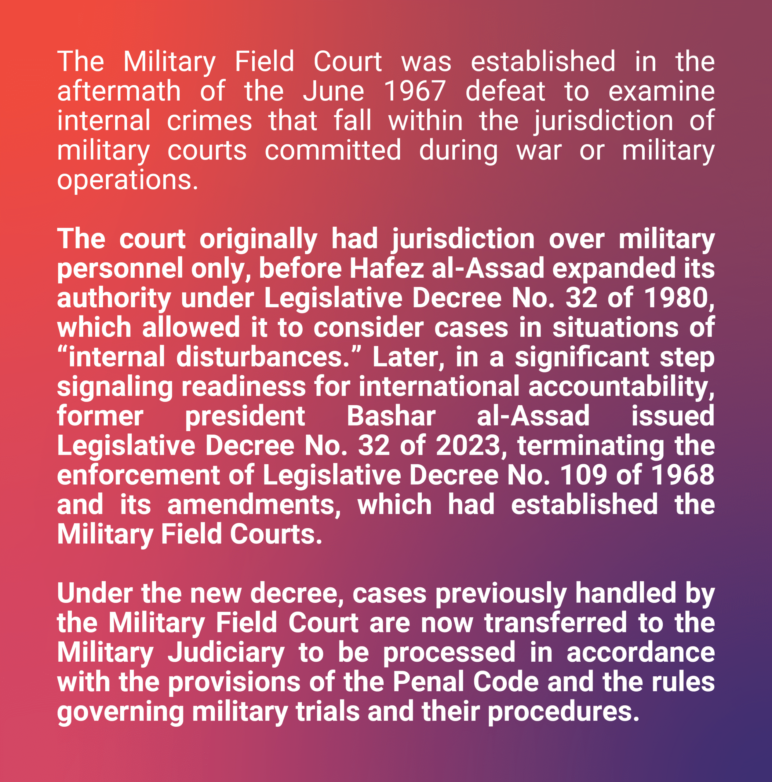 All official documents related to execution orders were signed by Field Marshal Bashar al-Assad as Commander-in-Chief, and delegated to General Ali Abdullah Ayoub, Minister of Defense. According to international legal experts, this constitutes prima facie evidence of the leadership’s knowledge of, and direct involvement in, the executions.